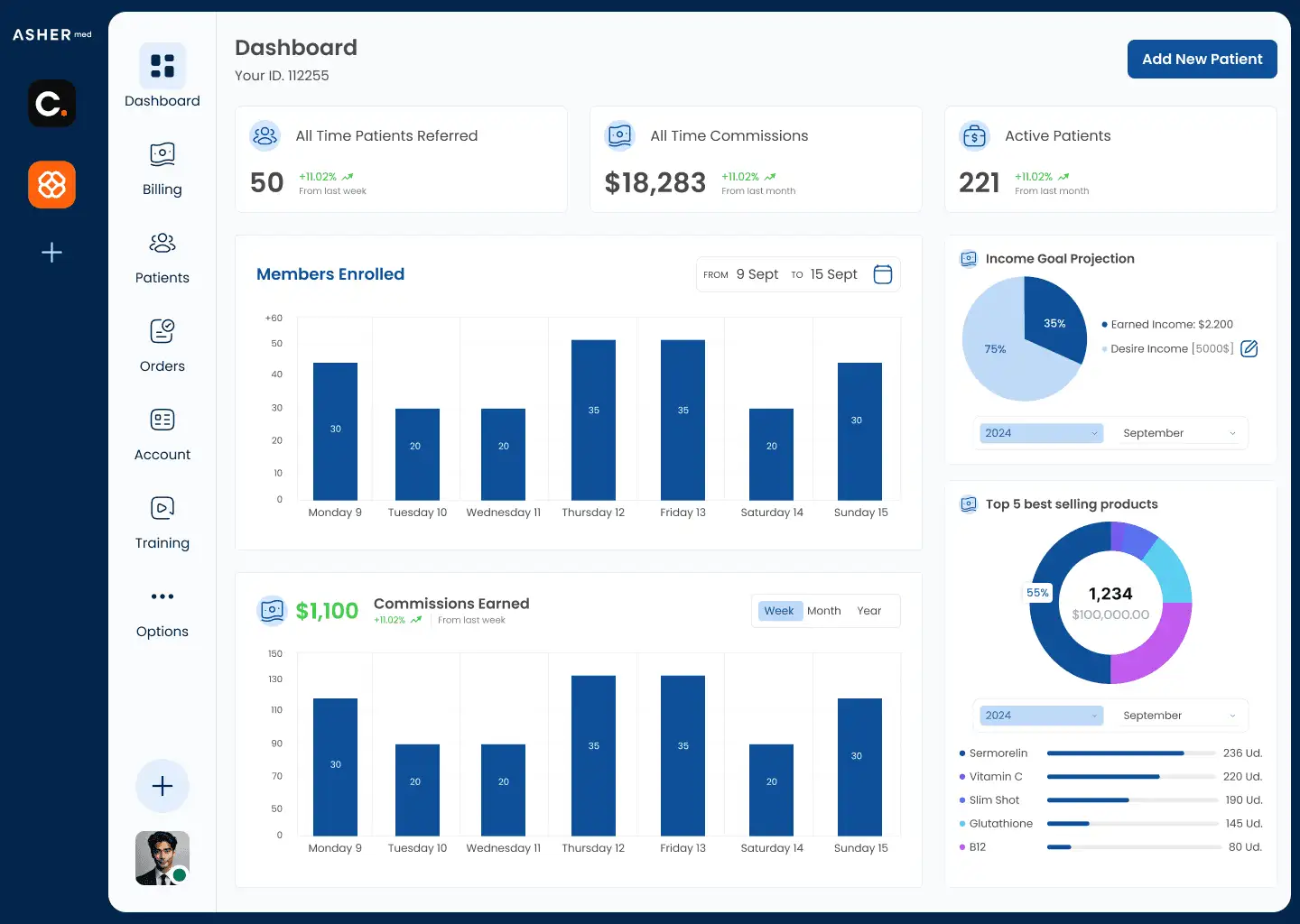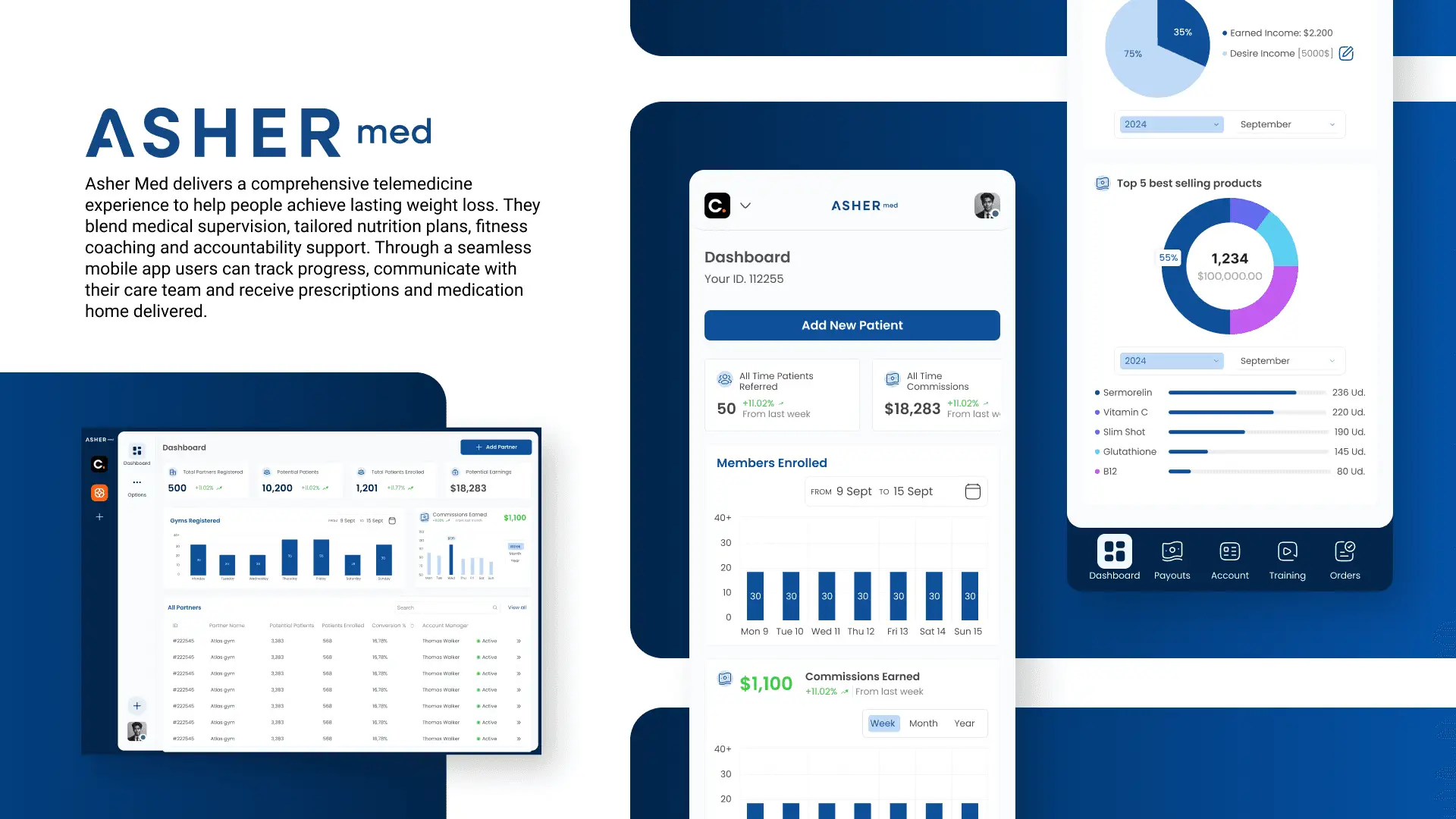 We built a clean, data-forward interface that supports both patients and care teams with clarity and efficiency. The visual language emphasizes trust, clinical precision, and ease of navigation. Dashboards were structured to provide quick insight into patient progress, partner performance, commissions, and product sales, while maintaining a calm and supportive user experience.