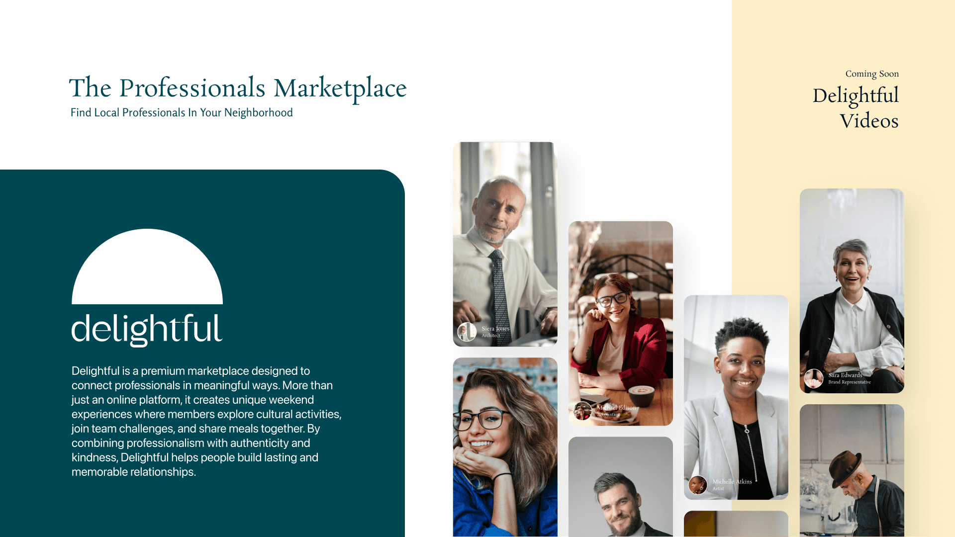 We created a visual identity and product structure that highlights human connection at its core. Warm photography, clean layouts and thoughtful spacing allow professionals to shine while maintaining a premium aesthetic. The design supports both search-and-discover workflows and the upcoming social features, such as Delightful Videos, that further strengthen trust and community engagement.