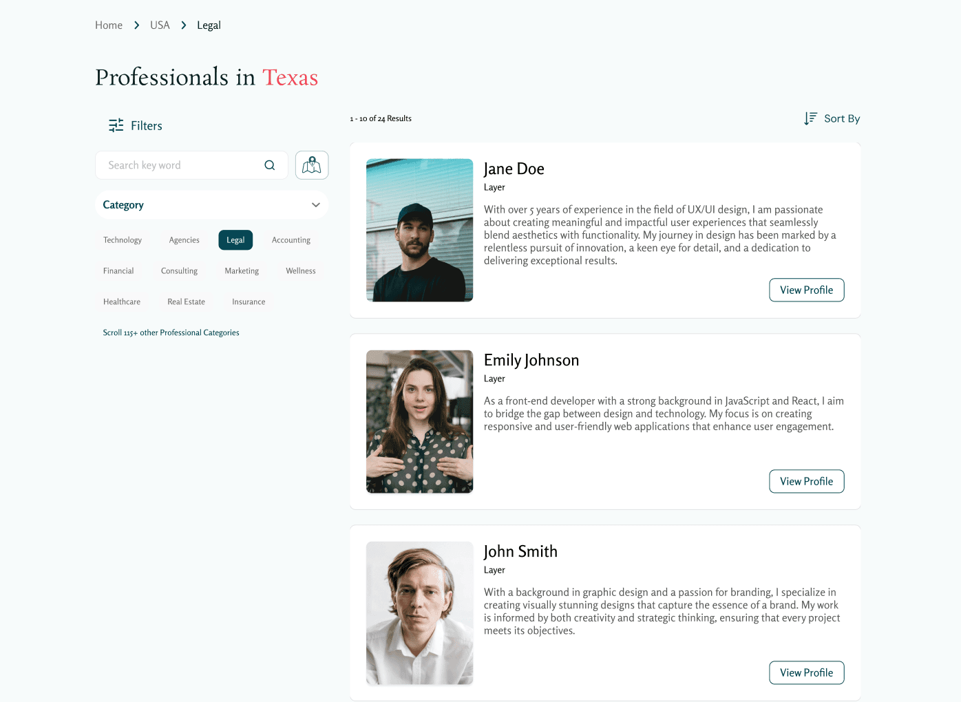 • Ensuring intuitive navigation for browsing, filtering and connecting with professionals.