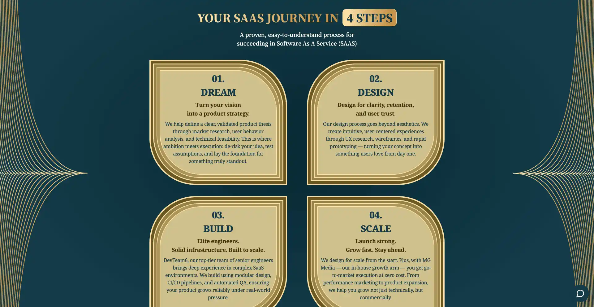 We crafted a website that communicates credibility, technical depth, and a premium partner experience. The visual system blends geometric patterns with a refined color palette to convey precision and scalability. The structure highlights Development 180’s strengths—experience, successful launches, client results—while presenting their services in a clear, founder-friendly narrative that aligns with how modern teams evaluate tech partners.